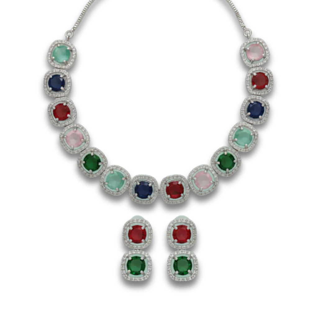 A silver tone jewellery set featuring a bold mix of rich red stones deep blue stones soft pink stones cool green stones placed in cushion shaped settings with bright clear stones surrounding each centre. The necklace forms a smooth curve across the neckline with each colour creating a striking pattern. Matching earrings follow the same style with a double stone layout that offers a refined finish. A vivid choice for formal wear or evening events with a luxurious vibrant look.
