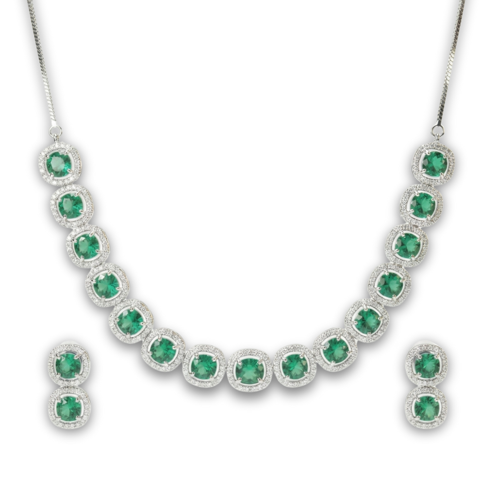 A silver tone jewellery set featuring vivid green stones placed in cushion shaped settings with bright clear stones around each centre. The necklace forms a smooth curve across the neckline with each stone creating a striking continuous layout. Matching earrings follow the same style with a double stone design that offers a refined finish. A bold choice for formal wear or special events with a rich vibrant look.