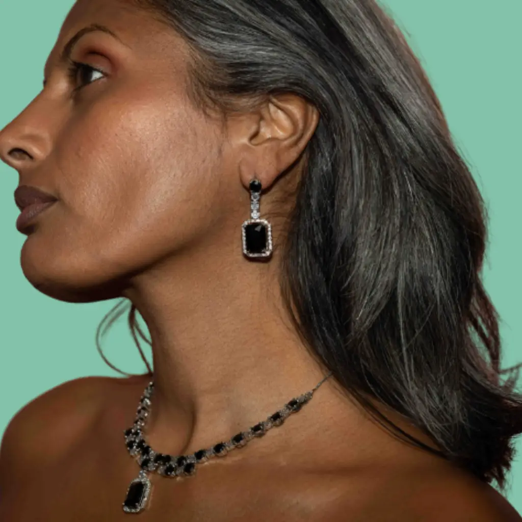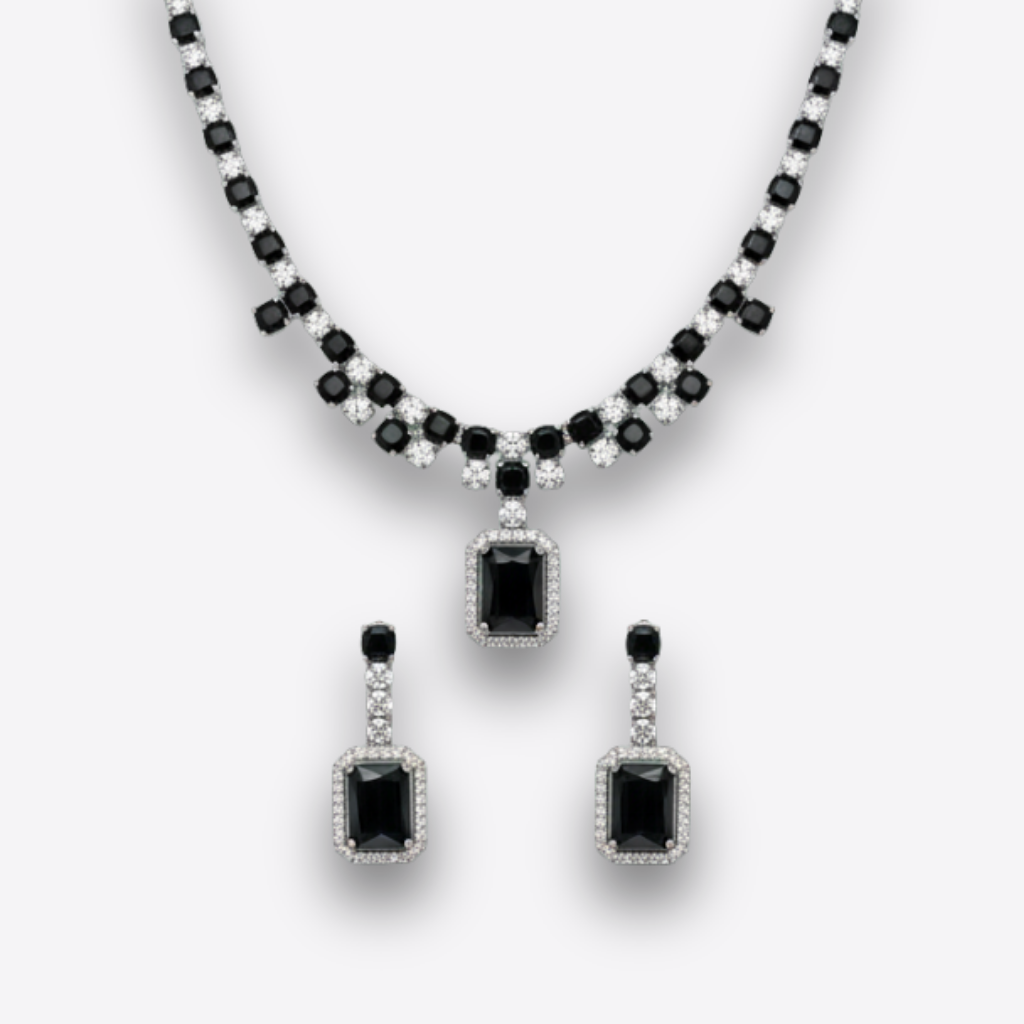 A luxury jewellery set featuring polished stones arranged along a refined chain which creates an elegant profile across the neckline. The centre displays an emerald-cut stone framed with bright detailing that provides a striking focal point. Matching earrings mirror the same emerald-cut style with a delicate drop finish which completes the set with graceful symmetry. Suitable for formal wear or evening occasions where a timeless elevated look is desired.