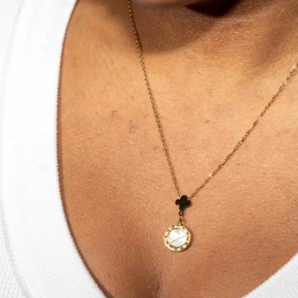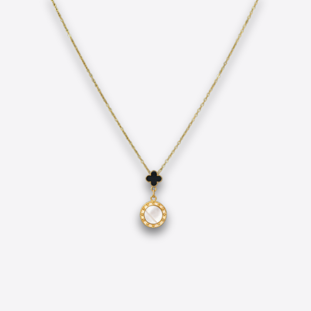 A necklace featuring a fine chain with a small motif placed above a circular pendant that holds a bright reflective centre framed by delicate stones. The layered layout creates a balanced elegant profile with a soft decorative touch. A versatile piece suitable for daily wear or special outfits with a refined modern presence.
