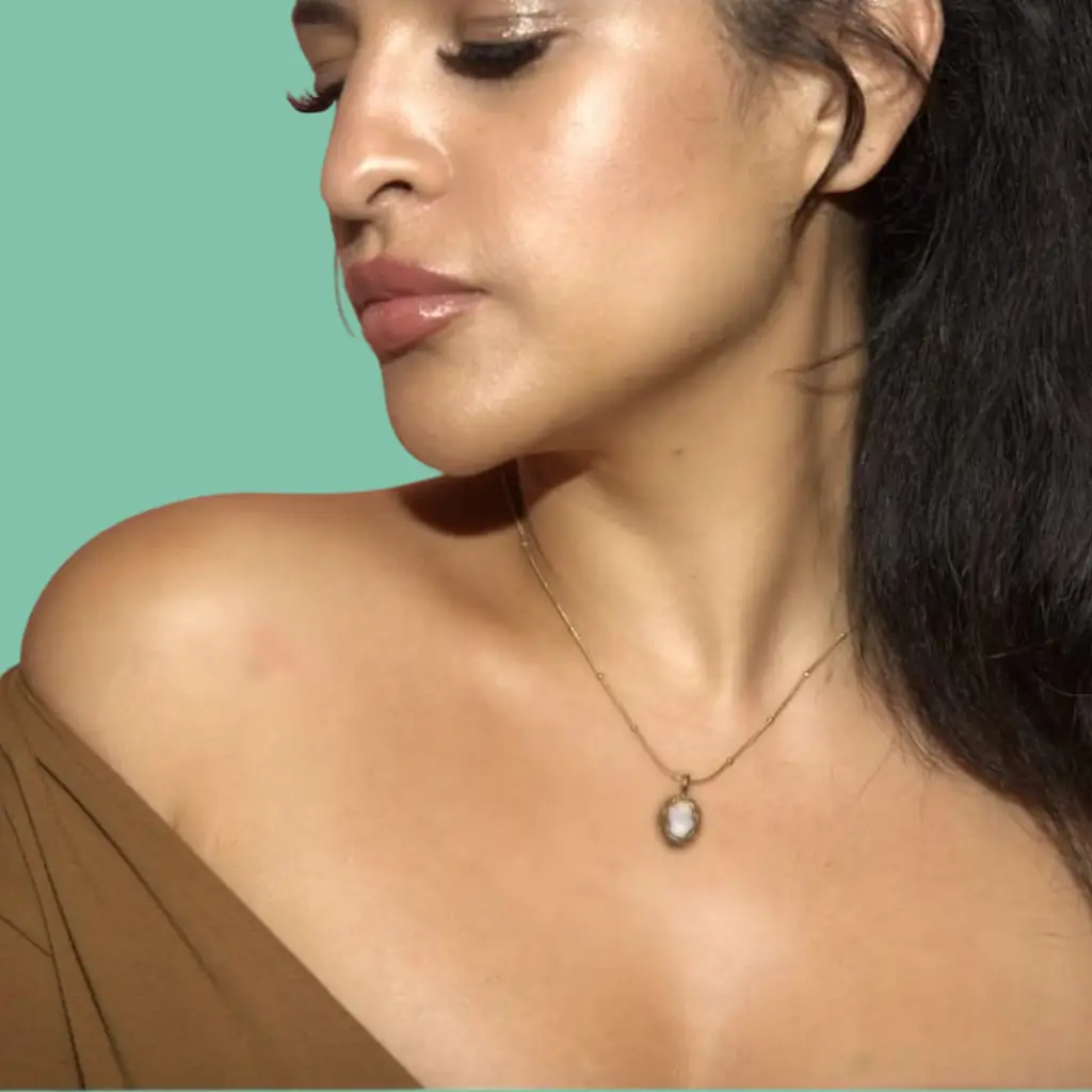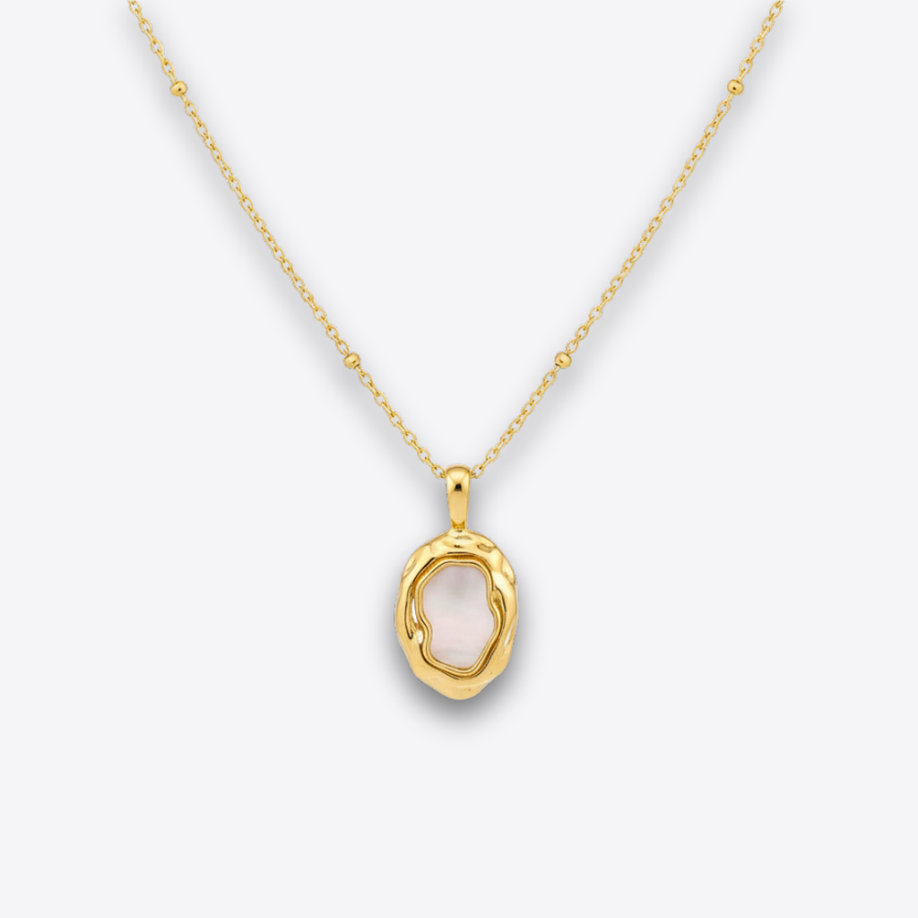 A necklace featuring a fine chain with small spaced accents that create a subtle decorative effect. The pendant presents an oval frame with a smooth reflective centre held within a sculpted border which gives a soft elegant finish. A refined piece suitable for daily wear or evening outfits with a classic contemporary look.