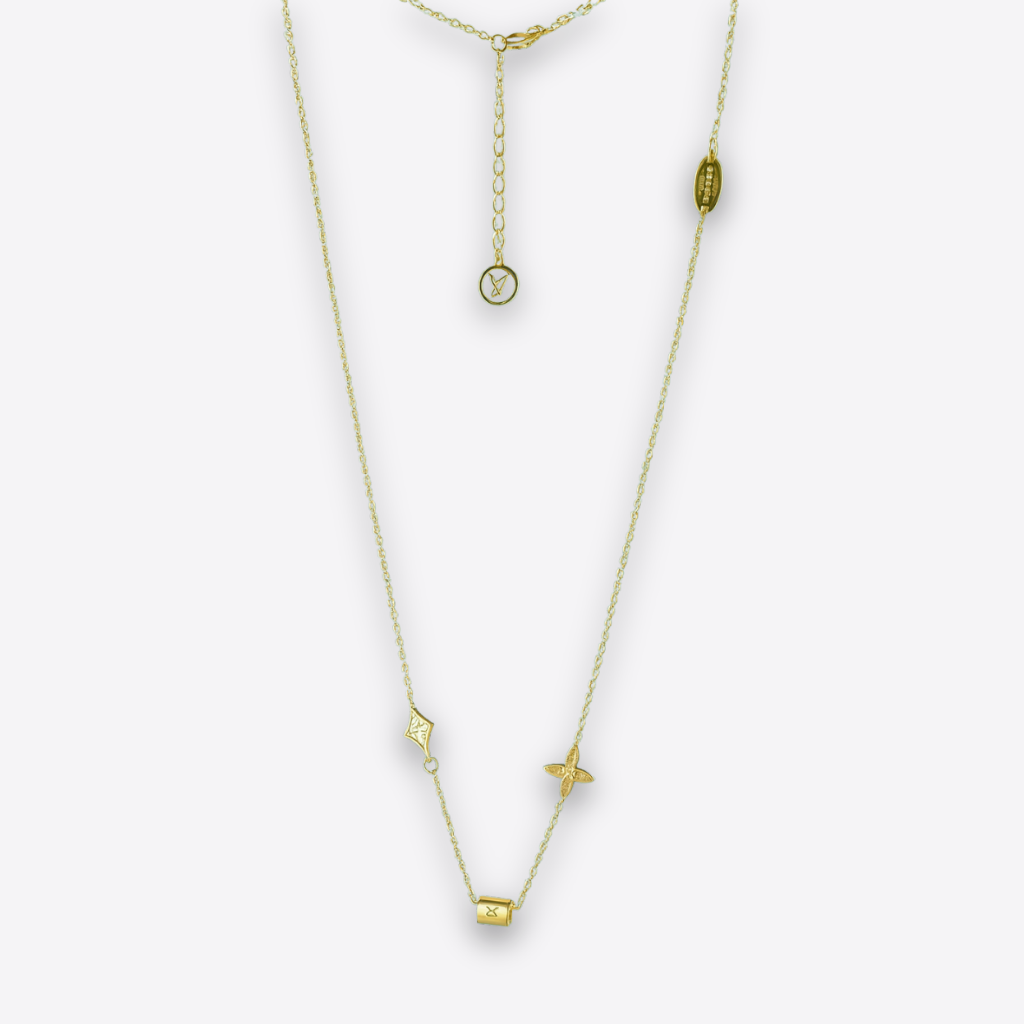 A layered necklace featuring two fine chains that sit at different lengths to create a soft balanced profile. The lower chain holds small geometric motifs placed along the front which give a delicate decorative touch. The upper chain presents a slim drop detail with a bright reflective centre that adds a subtle focal point. A light contemporary piece suitable for daily wear or special outfits with a refined modern style.