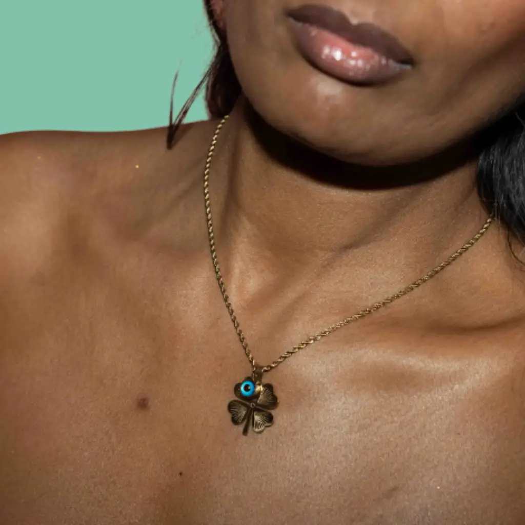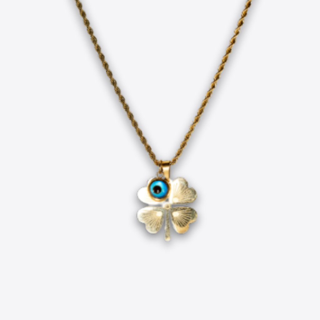 A polished necklace featuring a four-petal motif suspended from a fine chain. The centre of the pendant includes a rounded detail that introduces a distinct focal point while maintaining a clean refined outline. Its smooth contours create a balanced finish suitable for daily wear or as an understated accent for more elevated outfits.