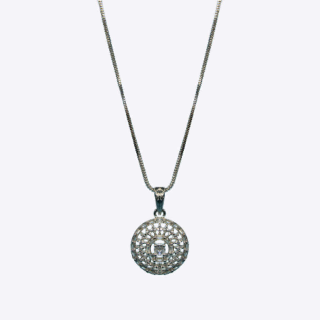 A necklace featuring a fine chain that leads to a round pendant formed with layered rings of reflective stones which create a bright detailed pattern. The centre holds a single clear focal point that gives a refined balanced finish. A classic piece suitable for formal wear or special outfits with an elegant polished presence.