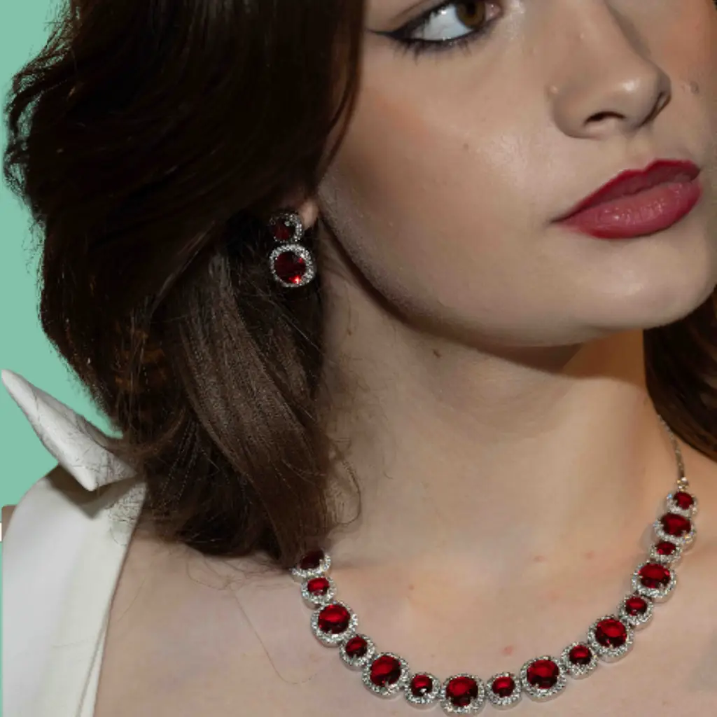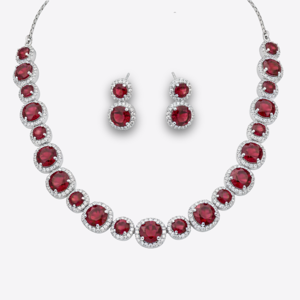 A jewellery set featuring a necklace with a continuous layout of round stones framed by bright reflective accents which create a polished radiant profile. Each stone sits in a smooth graduated sequence that forms a striking display across the neckline. Matching earrings present a paired drop motif with the same round stone detail which gives a refined balanced finish. A bold elegant choice suitable for formal wear or special events with a luxurious timeless presence.