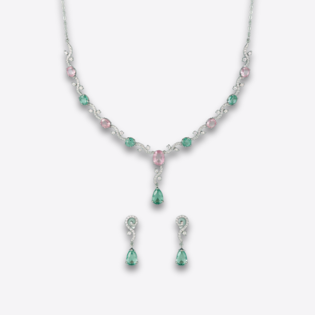 A jewellery set featuring a necklace with a sequence of round stones placed beside floral shaped motifs which create a soft flowing pattern. A teardrop pendant sits at the centre which forms a clear elegant focal point. Matching earrings follow the same teardrop style with a slim drop layout that offers a refined graceful finish. A delicate choice suitable for formal wear or special events with a polished bright presence.