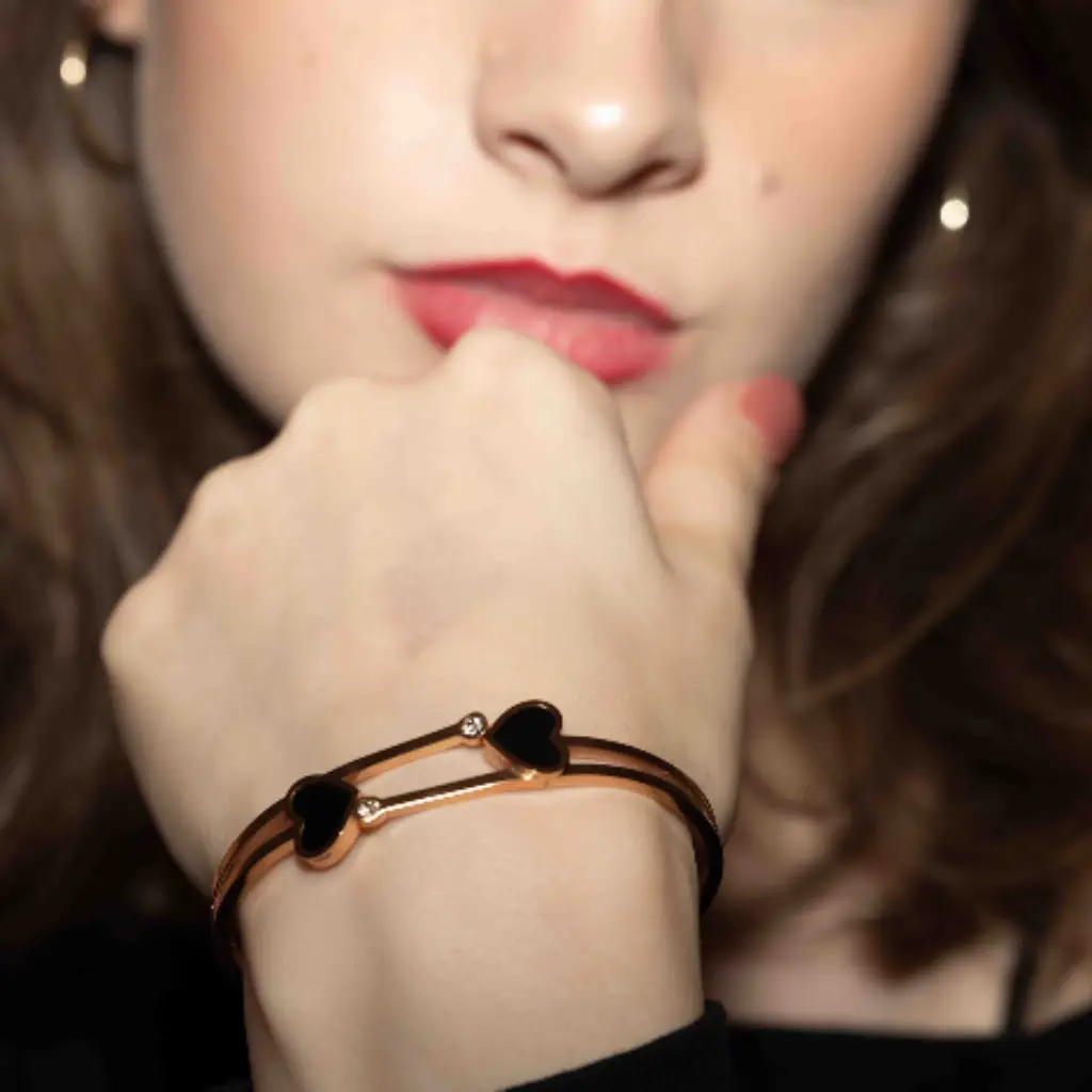 A slim bracelet featuring a polished band with two heart shaped motifs linked by a smooth bar detail. Small reflective accents sit at each end of the bar which create a delicate balanced touch. The open centred layout gives a light modern profile suitable for daily wear or evening outfits with a soft contemporary finish.