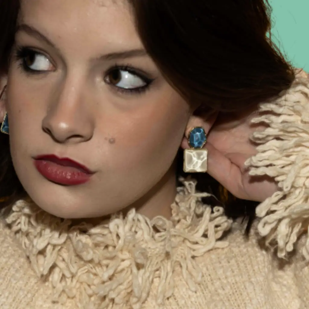 A contemporary pair of earrings featuring a two-part geometric design. Each earring combines an octagonal upper piece with a larger square drop element which creates a modern structured profile. The glossy surfaces display a soft reflective pattern that adds depth and interest while maintaining a polished minimal finish. Ideal for styling with both casual looks or more refined outfits.